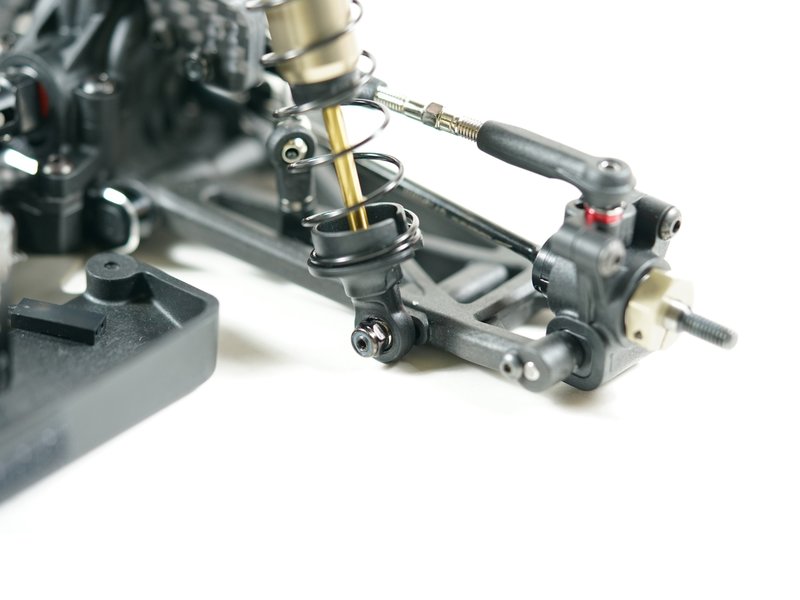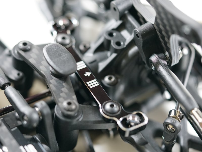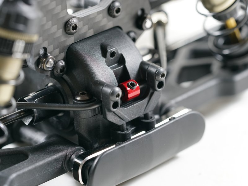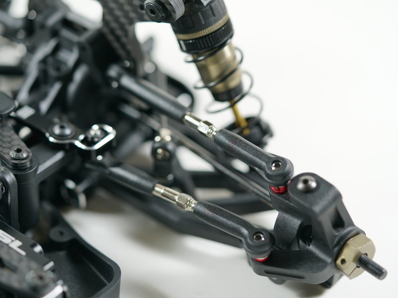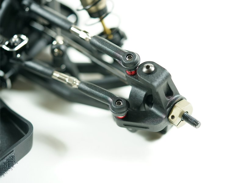 Ein brandneues 5,5-mm-Gelenkkugelbolzensystem und 3,5-mm-langlebige Spannschlösser sind im S14-4C-Kit enthalten. Brandneue verstellbare Ackermannplatte mit erleichtertem Lenkwinkelsystem sind ebenfalls enthalten. Der S14-4C hat neue hintere abgewinkelte untere Querlenker, die eine niedrigere Stoßdämpferposition bieten, was zu einem niedrigeren Schwerpunkt führt. Die Querlenker des S14-4C sind aus hochwertigem Pro Composite Carbon-Material gefertigt.